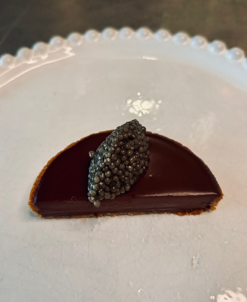 デザートは、スペシャリテのケッパー風味のチョコレートタルト キャビア添え。