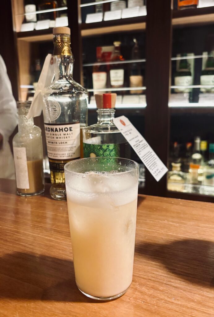 Mixology Boutiqueでは、旬のフレッシュフルーツをふんだんに取り入れています。夏の果実といえば白桃。その新鮮な桃を丸ごとミキサーにかけ、Zyooと合わせた即興カクテルをご用意くださいました。味わいを引き締めるために加えられたのは、南雲氏が開発したジャスミンの花の香りを閉じ込めたウォッカ。白い花のピュアで甘美なフローラル、瑞々しい桃、そして米麹によるやさしい甘さをもつ生姜の風味が三位一体となり、夏のアペリティフにふさわしい一杯に仕上がっています。